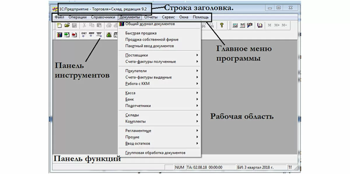После запуска системы на экране открывается окно программы, в верхней части которого находится строка заголовка, содержащая название программы и ее редакцию, ниже – строка, содержащая главное меню программы, а под ней – панели инструментов, содержащих наборы кнопок для быстрого вызова команд. Ниже расположена рабочая область главного окна программы и панель функций.