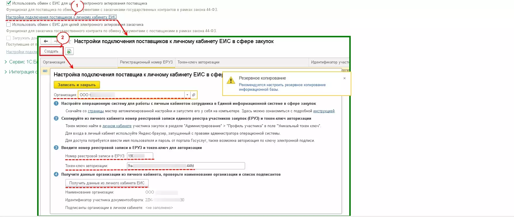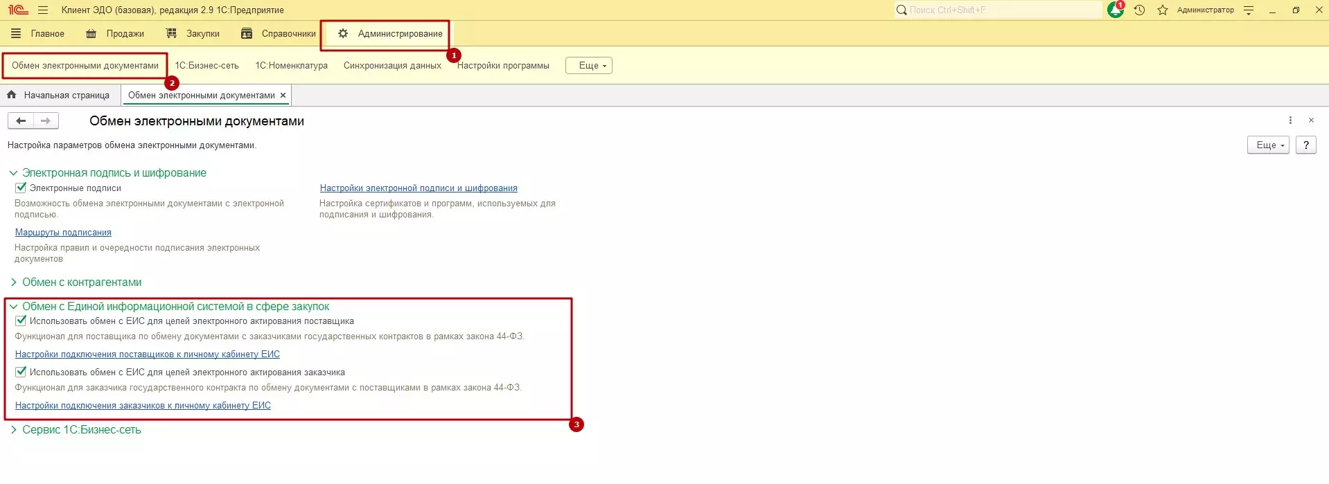 Для этого необходимо открыть раздел Обмен электронными документами → Раскрыть Обмен с Единой информационной системой в сфере закупок → проставить необходимые галочки.