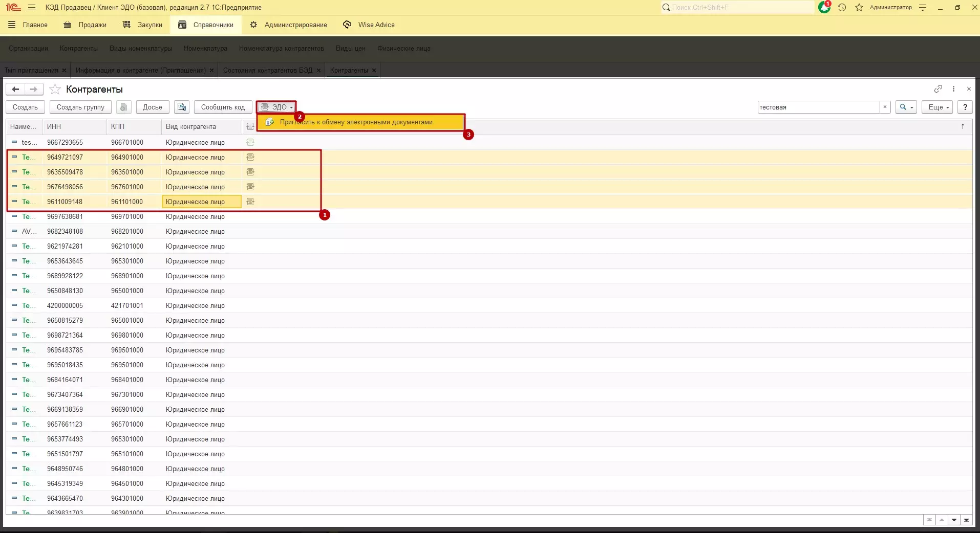 Контрагентов, по которым есть данные о наличии Учетной записи ЭДО, можно выделить и пригласить к обмену электронными документами прямо из справочника.