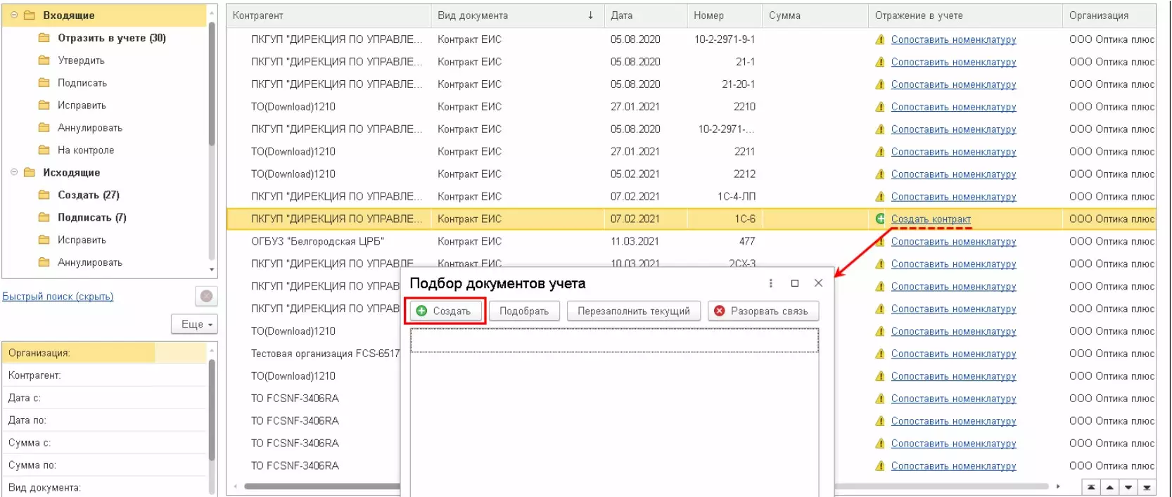 При нажатии на кнопку «Отправить и получить» будут загружены сведения о контрактах, которые отражаются в списке входящих электронных документов с видом документа Контракт ЕИС. По кнопке-ссылке «Создать контракт» откроется форма подбора документов учета, а по кнопке «Создать» необходимо добавить и заполнить новый элемент справочника государственных контрактов ЕИС.