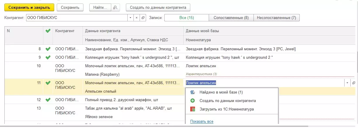Рассмотрим функционал сопоставления номенклатуры для автоматического создания учетного документа в ИБ (информационной базе). Сопоставить номенклатуру предлагается при первом получении документа с новыми номенклатурными позициями.