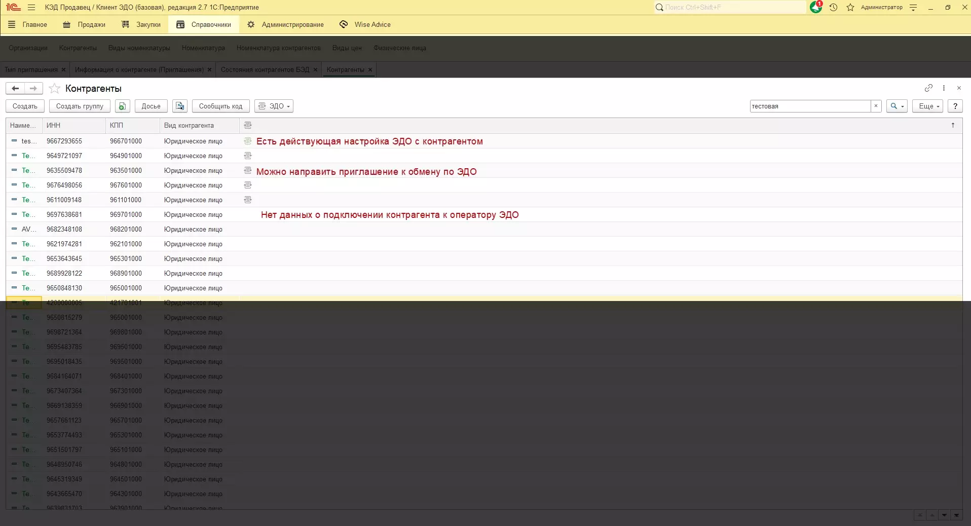 Данные о состоянии подключения контрагента к ЭДО можно увидеть в справочнике «Контрагенты» в определенном столбце с символом системы 1С-ЭДО.