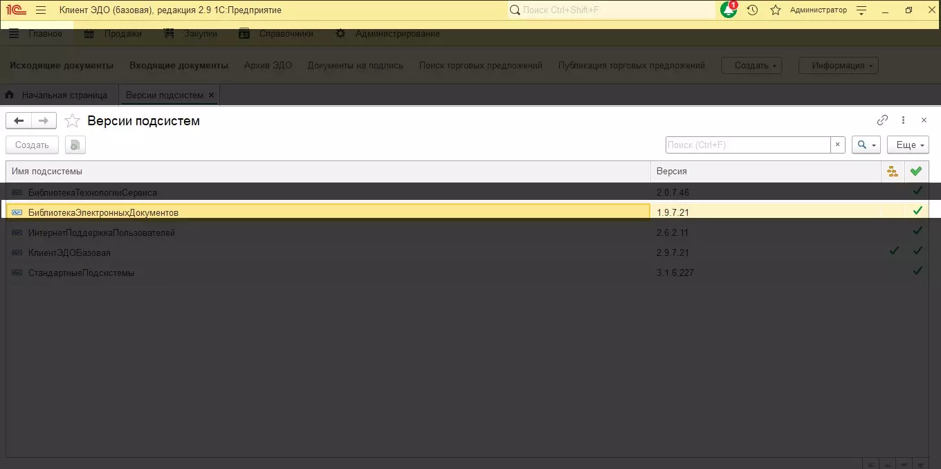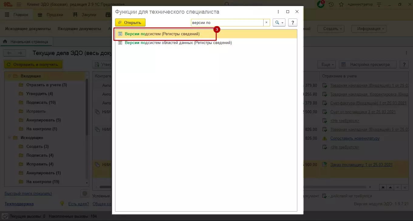 Проверить версию БЭД в своей конфигурации можно, пройдя по пути: Функции технического специалиста → Версии подсистем.