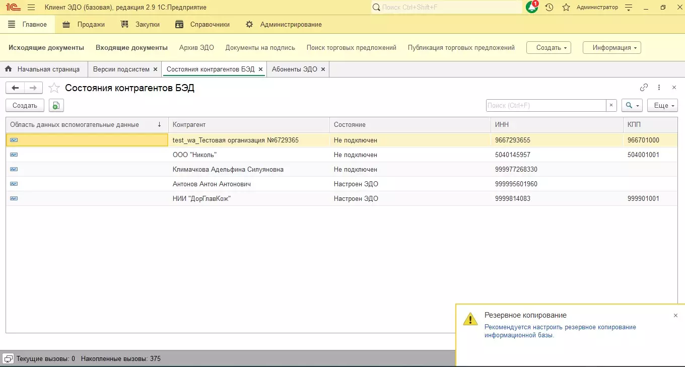 Также помощником в настройке работы по ЭДО с контрагентами служит Регистр Сведений: Состояние Контрагентов БЭД.
