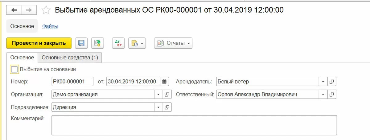 - В случае досрочного прекращения договора нужно сформировать «Выбытие арендованных ОС»;