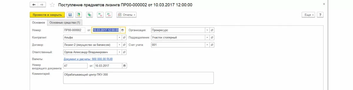- Поступление в лизинг оформляется документом «Поступление предметов лизинга», который формирует обязательства перед лизингодателем и стоимость оборудования к принятию к учету;