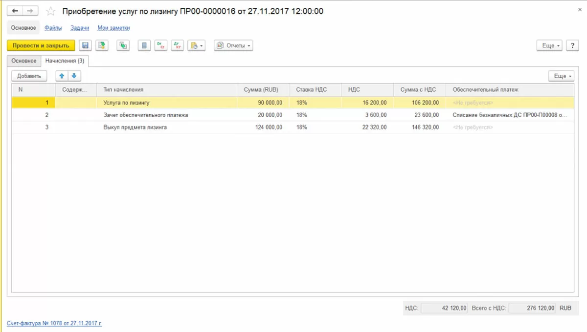 - Ежемесячные начисления и зачеты обеспечительного платежа, а также начисление выкупной стоимости делаются через «Поступление услуг по лизингу»;