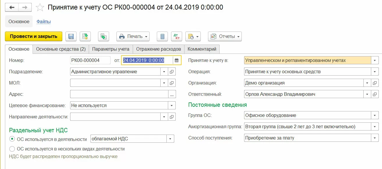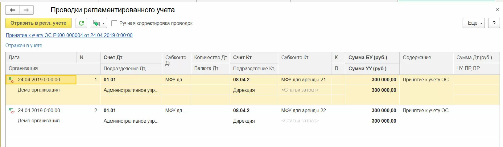 - Возникающие из-за разницы стоимости оборудования в БУ и НУ налоговые обязательства и активы будут рассчитаны автоматически регламентной операцией в рамках шагов по закрытию месяца.
