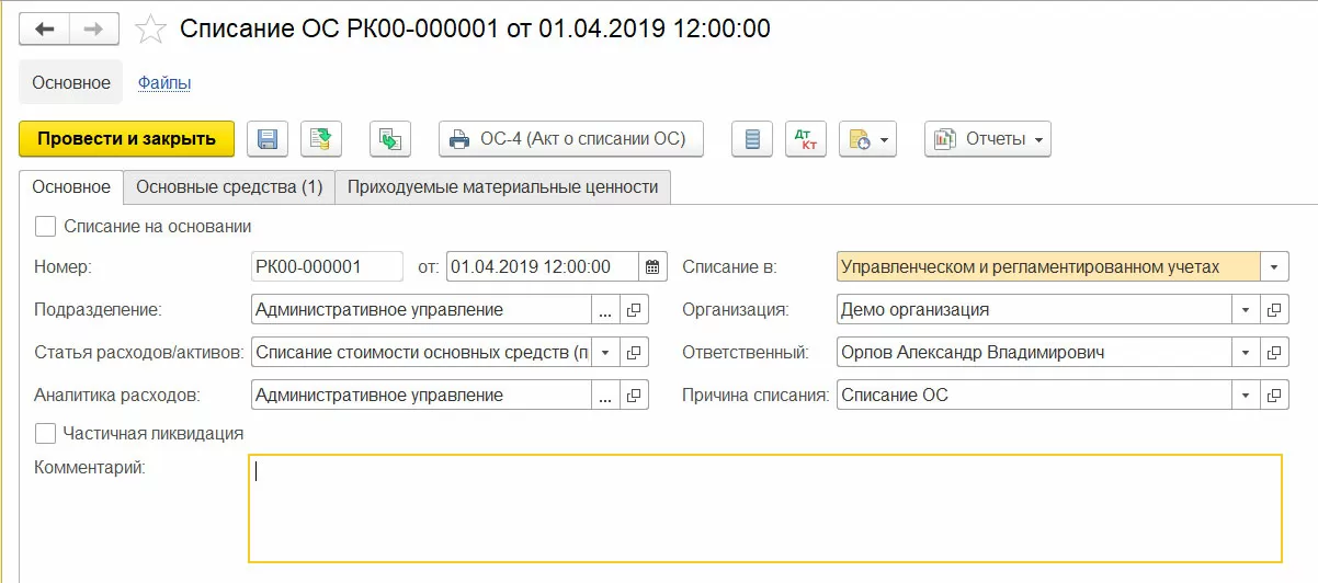 - В случае досрочного прекращения договора нужно списать ОС (документом «Списание ОС»);