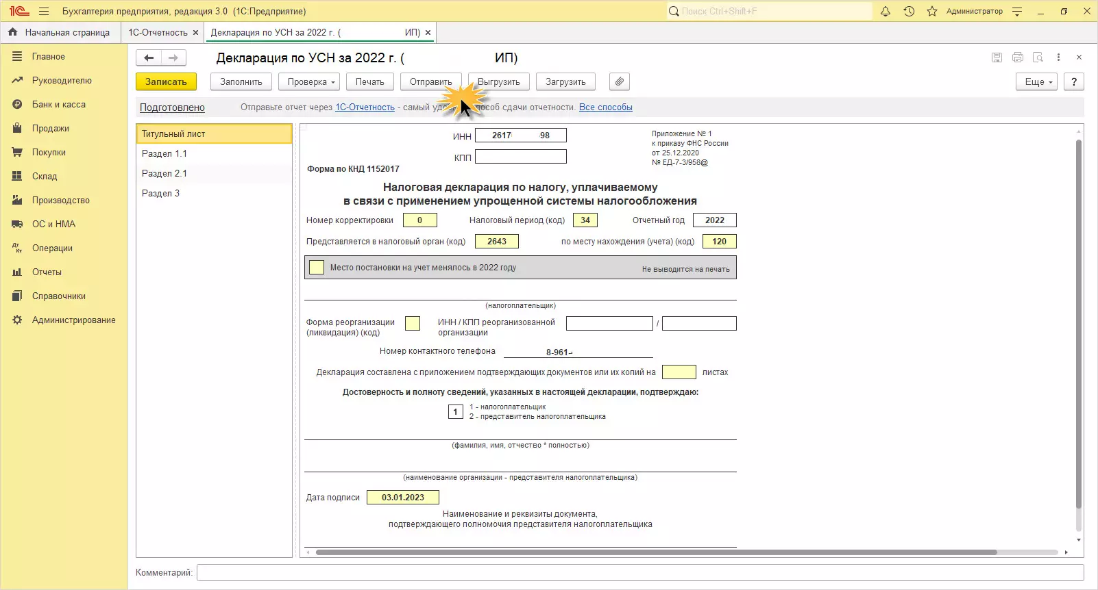 Пользователю достаточно своевременно и в полном объеме отразить текущие операции, и отчет сформируется автоматически. Останется нажать лишь Отправить.