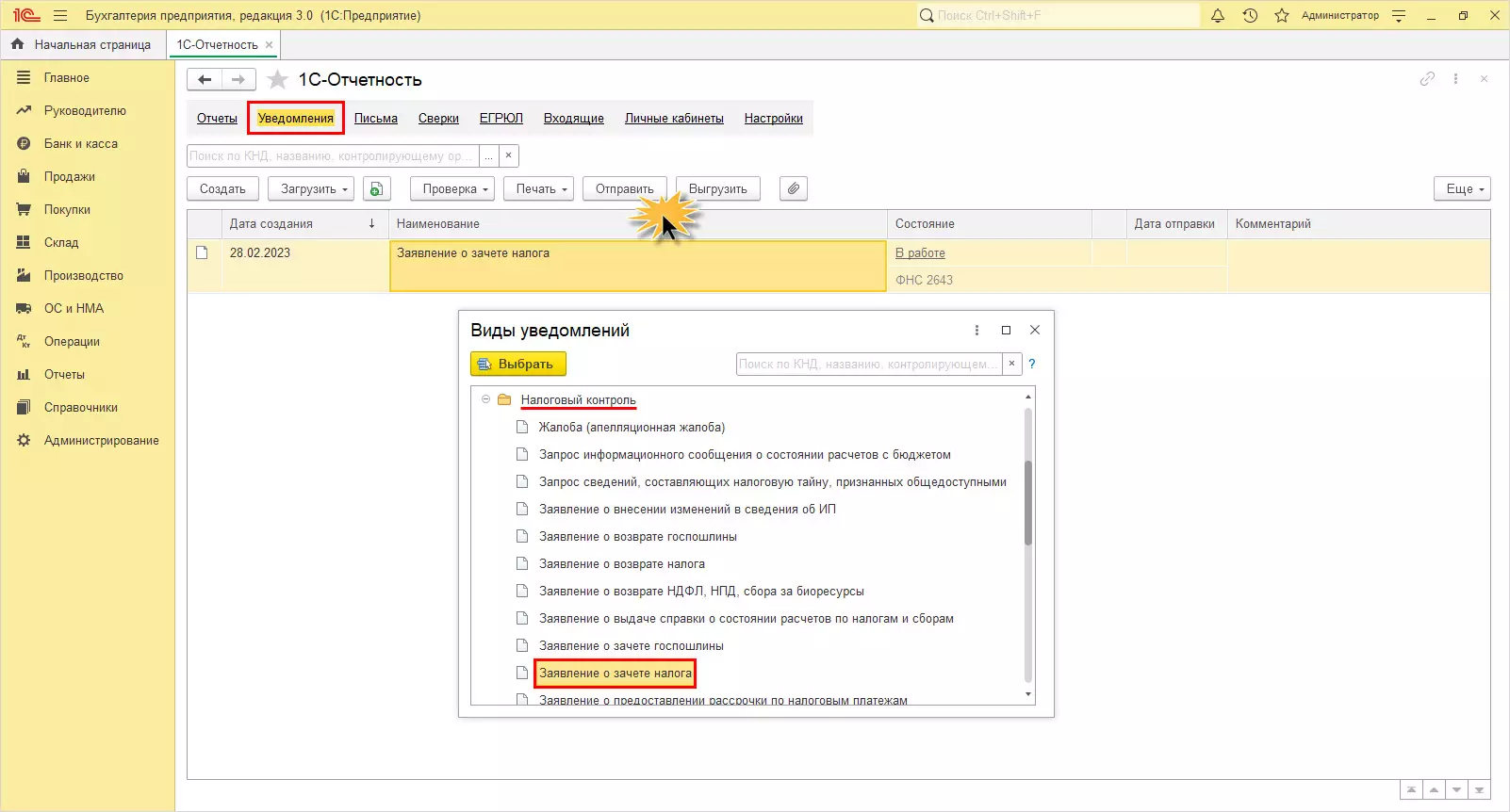 Шаг 1. Зайти в 1С-Отчетность, раздел Уведомления.