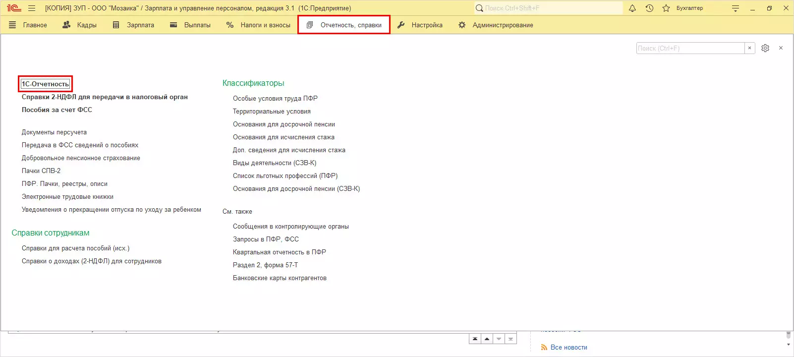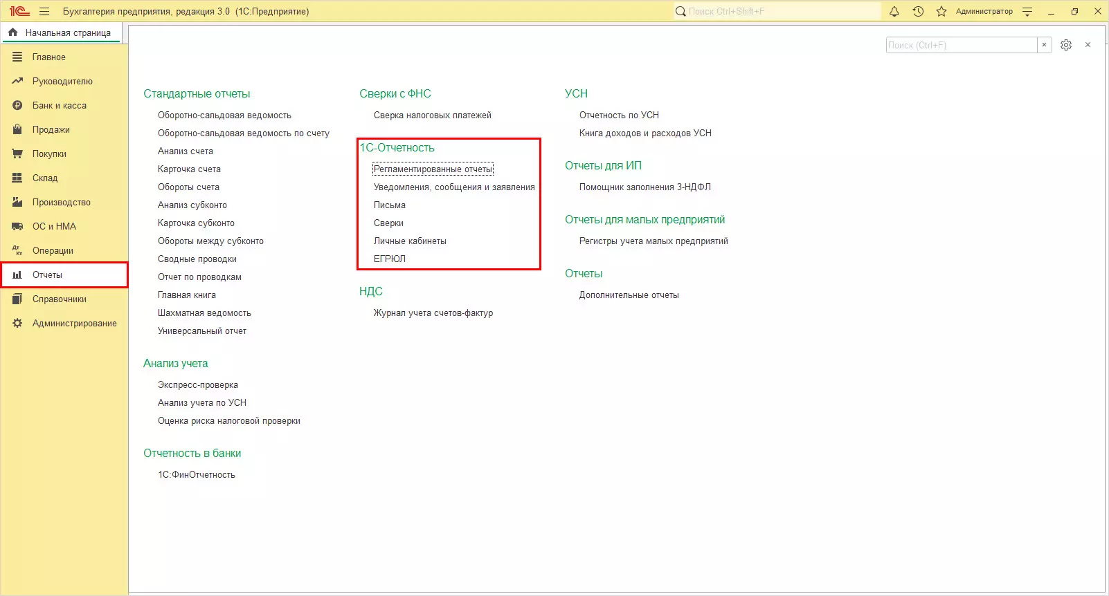 Блок 1С-отчетность во всех конфигурациях располагается в разделе с отчетностью. Например, в 1С:Бухгалтерия предприятия это раздел Отчеты.