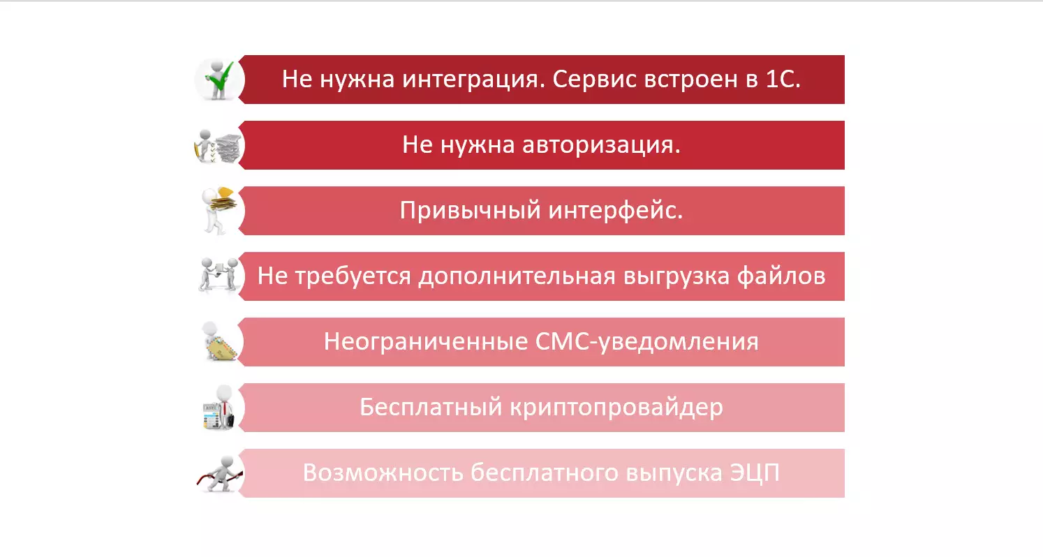 - Не требуется куда-то выгружать и загружать файлы отчетов, писем, повторно заполнять формы. Все отчеты создаются и отправляются из учетной программы 1С.