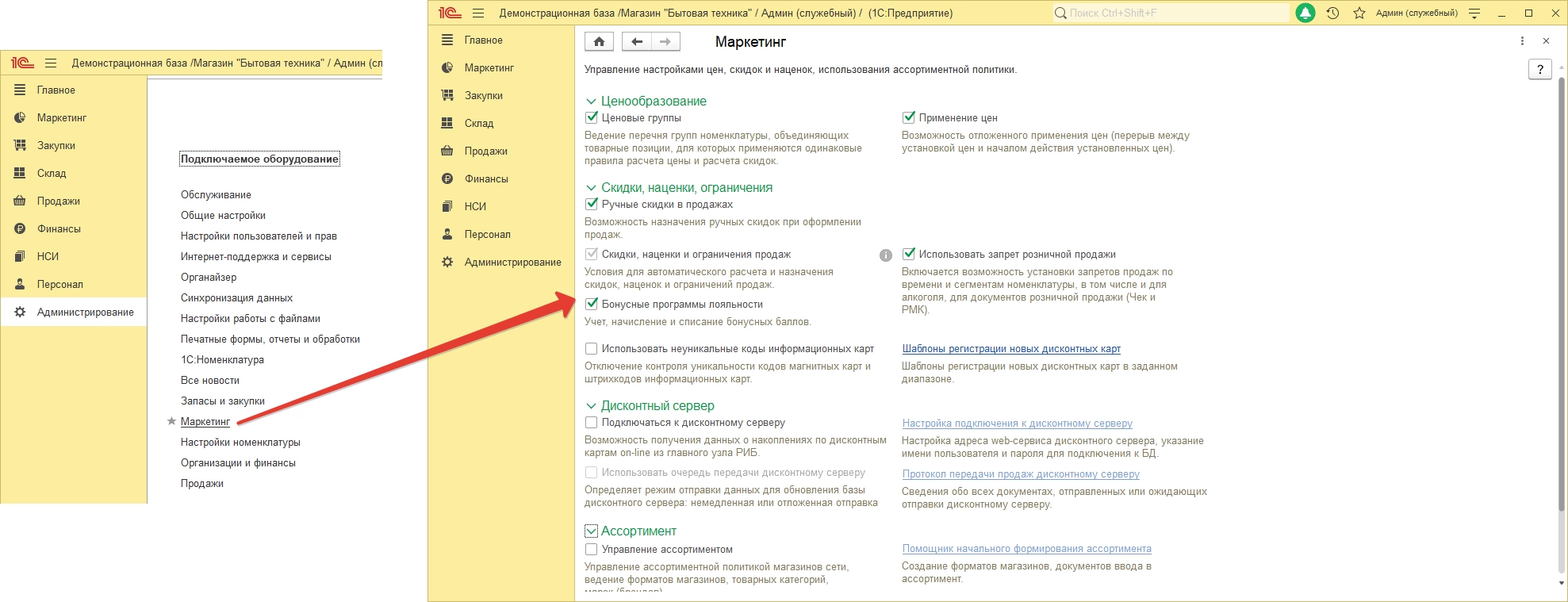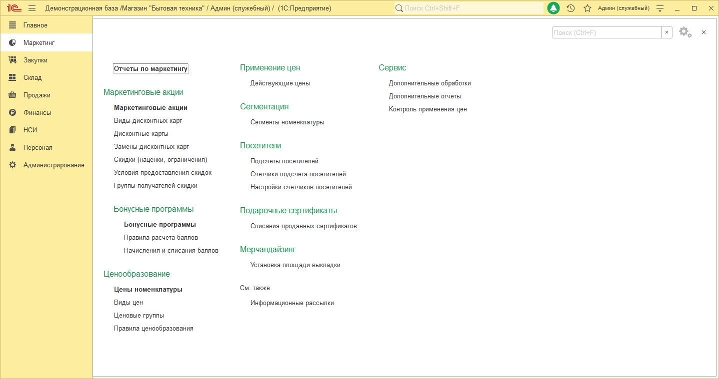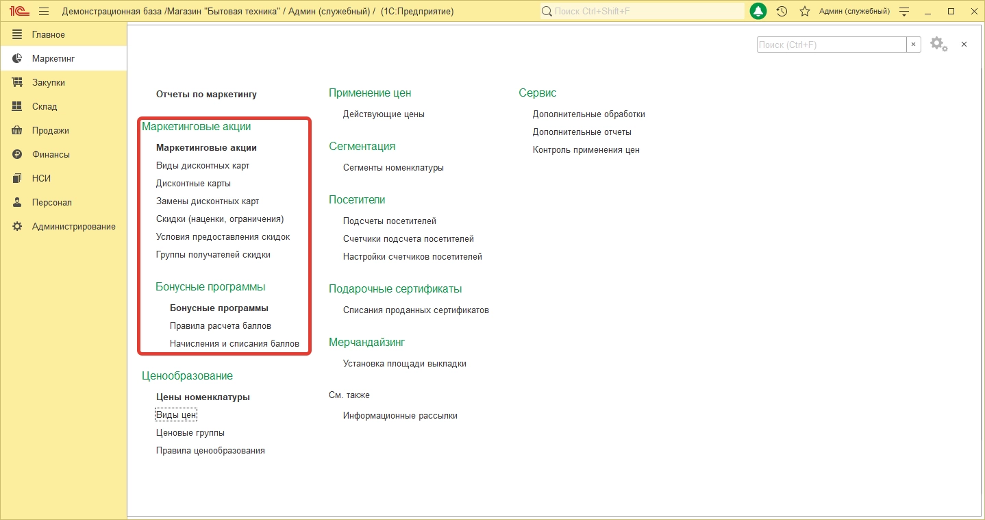 Для установки и контроля скидок надо зайти в раздел «Маркетинг» на закладке «Администрирование».