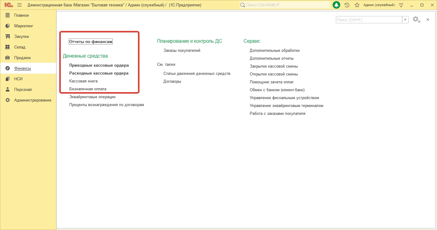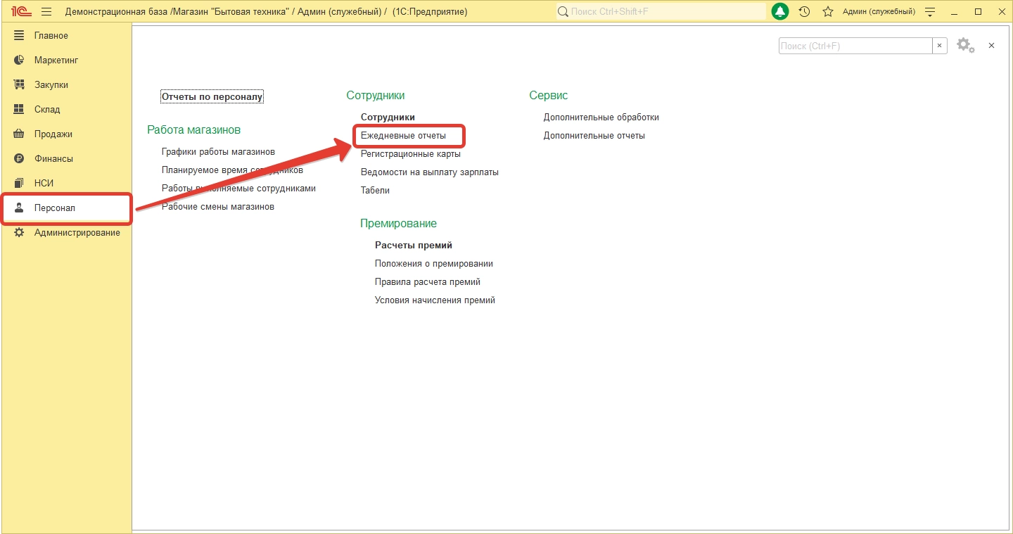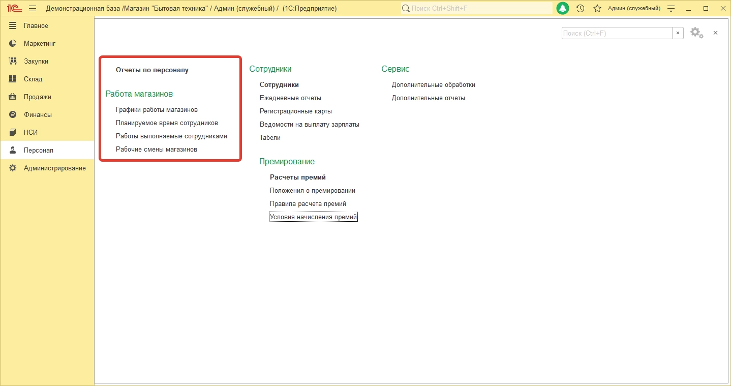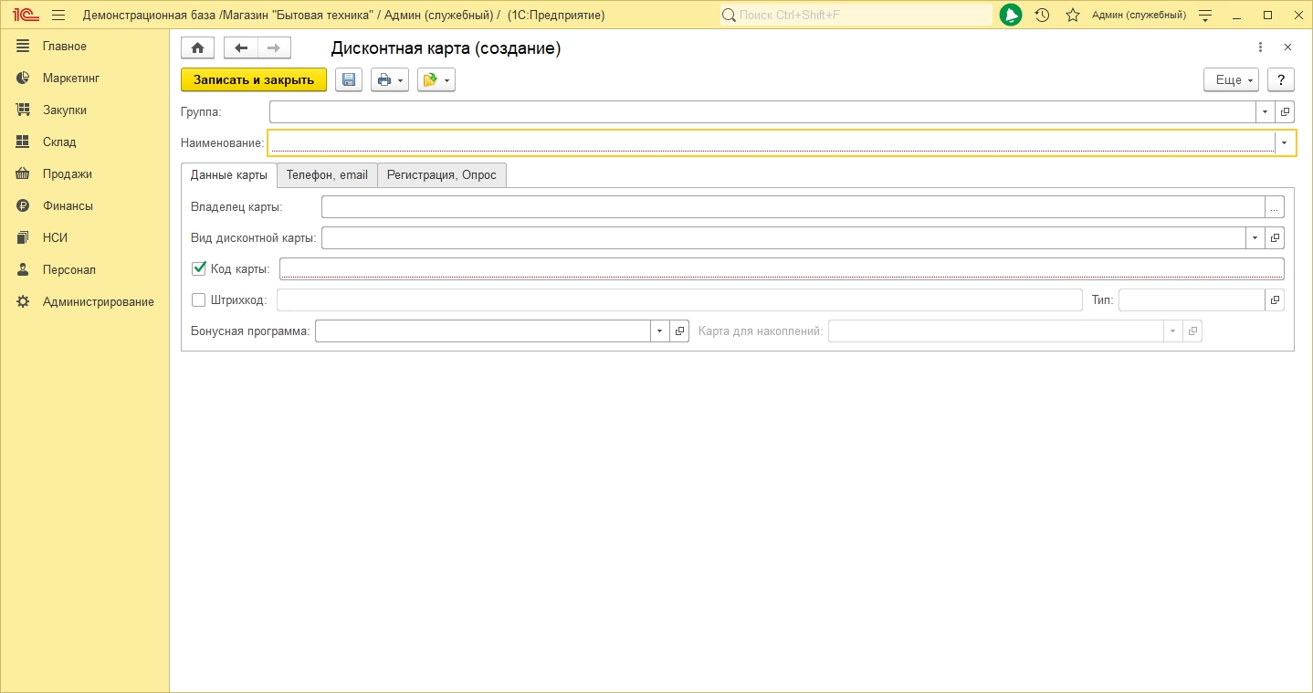 Для установки и контроля скидок надо зайти в раздел «Маркетинг» на закладке «Администрирование».