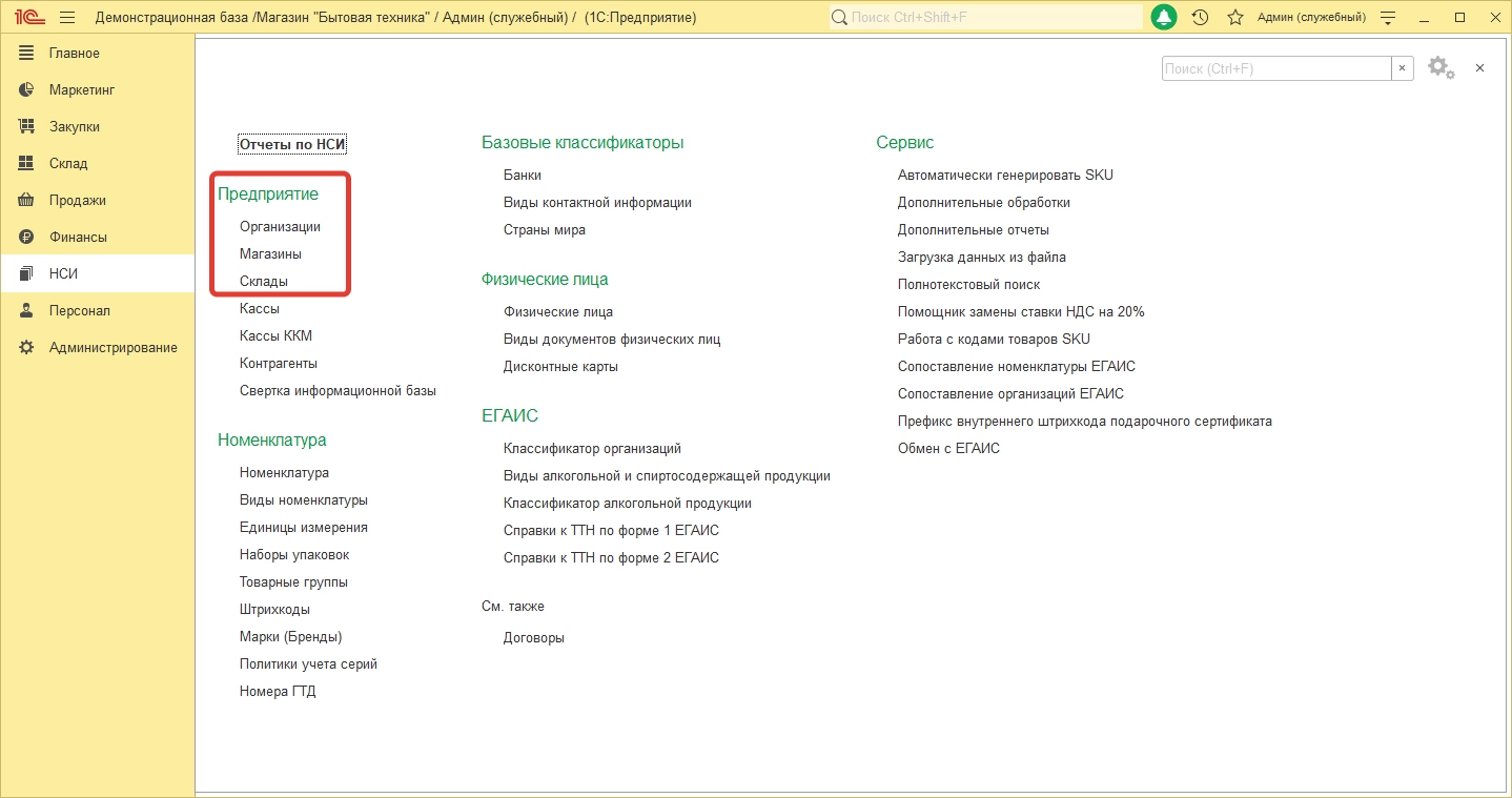 Структуру своего предприятия можно сформировать на вкладке НСИ (нормативно-справочная информация) – внести данные об организации, магазины, выделить склады.