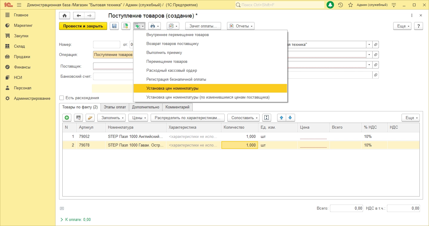 Задать цены проще всего из документа «Поступление товаров» по кнопке «Создать на основании» - «Установление цен номенклатуры».