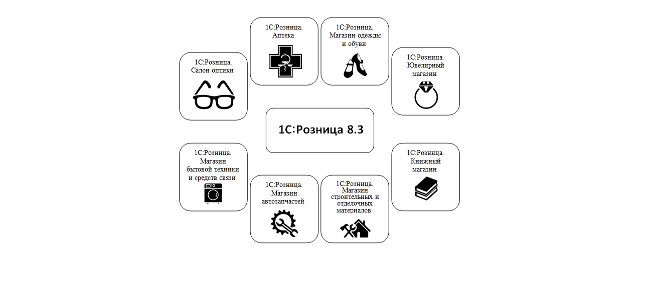 Хотя 1C:Розница является одним из самых «простых» и узкоспециализированных решений 1С, на ее базе выпускаются программные продукты для автоматизации предприятий торговли конкретных отраслей торговли – торговля одеждой и обувью, книгами, строительными и отделочными материалами, ювелирными изделиями, лекарствами и пр.