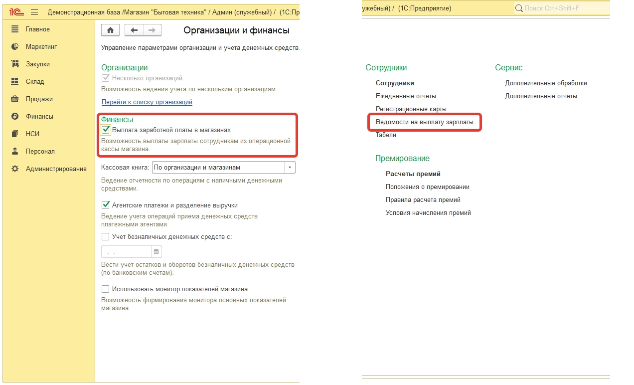 Настройка программы в части зарплаты производится в разделе «Администрирование» - «Организация и финансы».