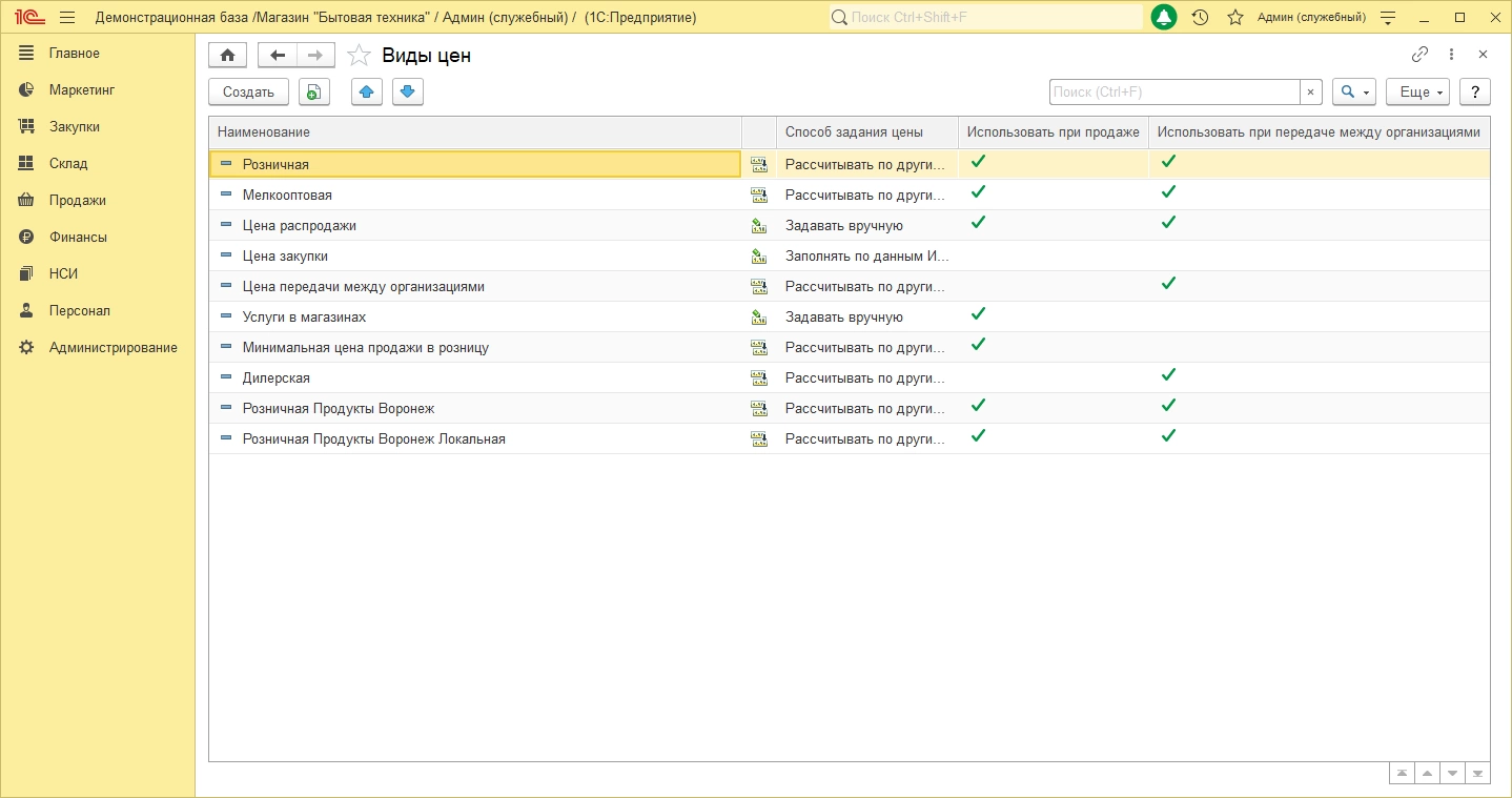 Конфигурация 1С:Розница позволяет регистрировать несколько типов цен, задавать определенные алгоритмы расчета цены, устанавливать различные виды скидок.
