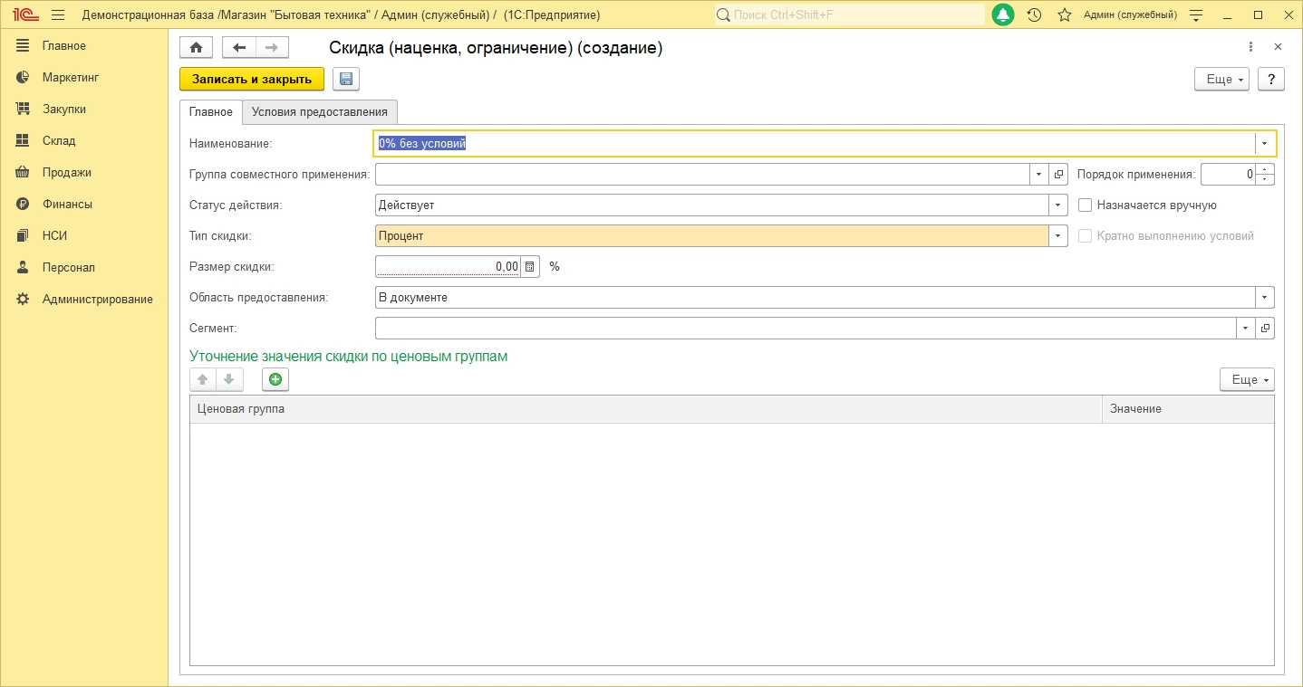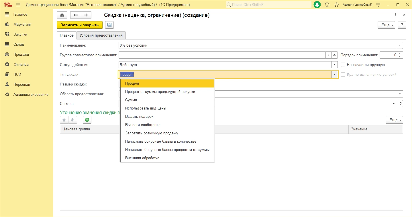 За автоматическое назначение скидок отвечает раздел «Маркетинговая акция». После его настройки доступен ряд пунктов, позволяющих произвести дополнительную настройку скидок.
