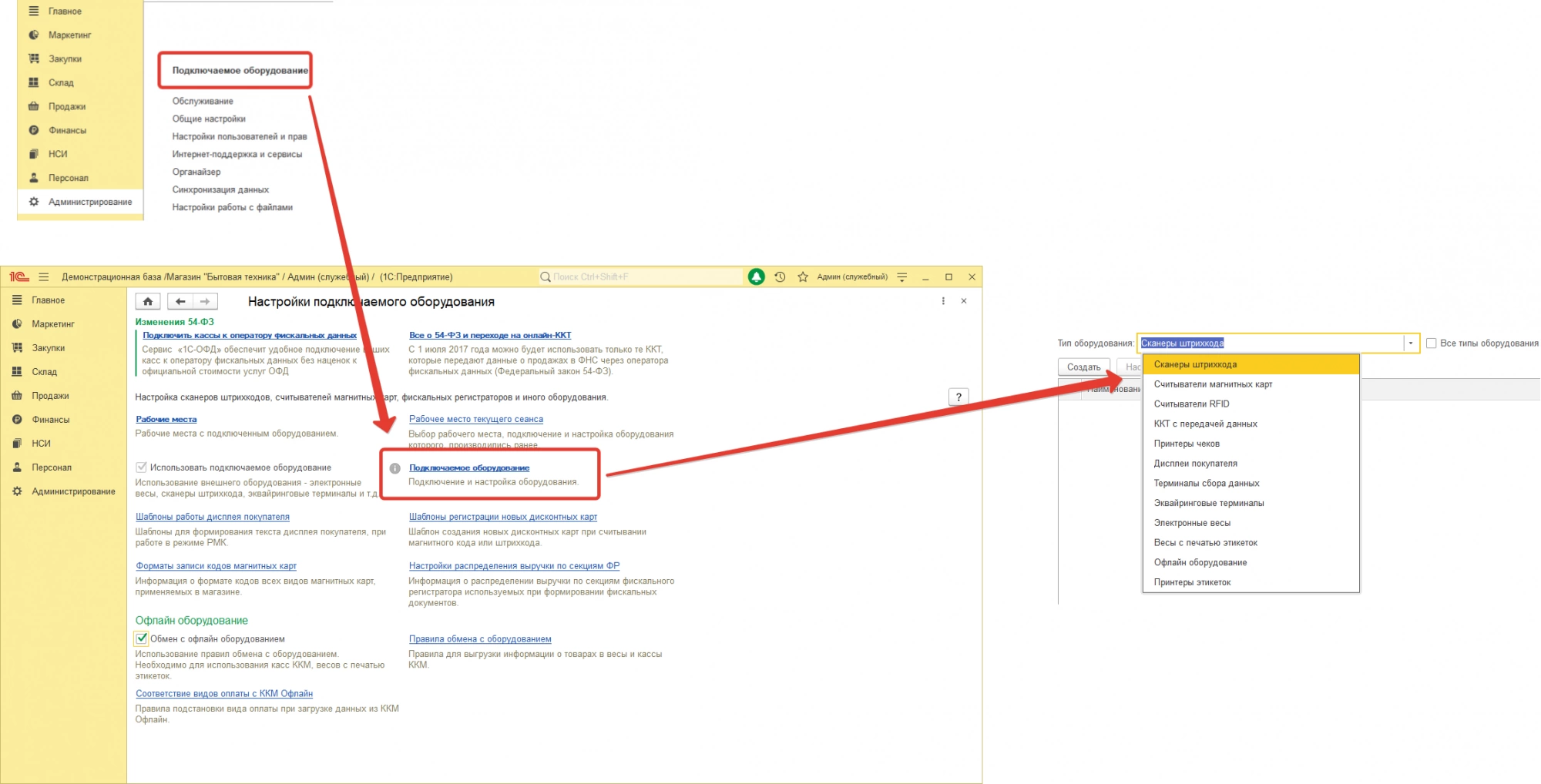 Возможно подключение сканеров штрих-кодов, считывателей магнитных карт, фискальных регистраторов, терминалов сбора данных, электронных весов, принтеров чеков, дисплеев покупателя, эквайринговых систем и другого оборудования. Для настройки оборудования существует мастер подключения, а также путь через закладку «Администрирование - Подключаемое оборудование - Настройка подключаемого оборудования».