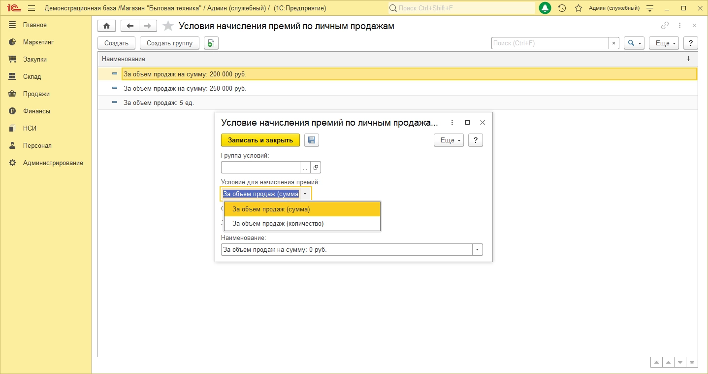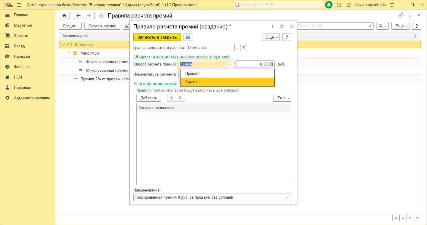 Здесь же можно начислять премии сотрудникам, устанавливать правила ее расчета, например, по достижении продавцом определенного объема продаж в суммовом или количественном выражении любого товара или товаров из определенного списка или группы номенклатуры. Продавцу может быть предоставлена премия в виде конкретной суммы или процента от суммы продаж.