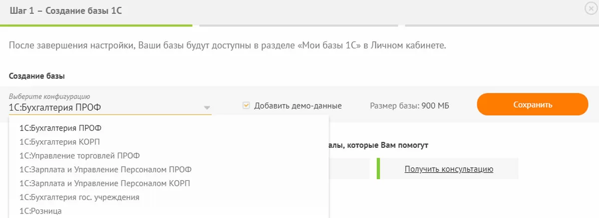При создании базы можно выбрать одну из доступных конфигураций, они представлены в выпадающем списке. Также можно протестировать демо-версию, поставив галочку в соответствующем окошке.