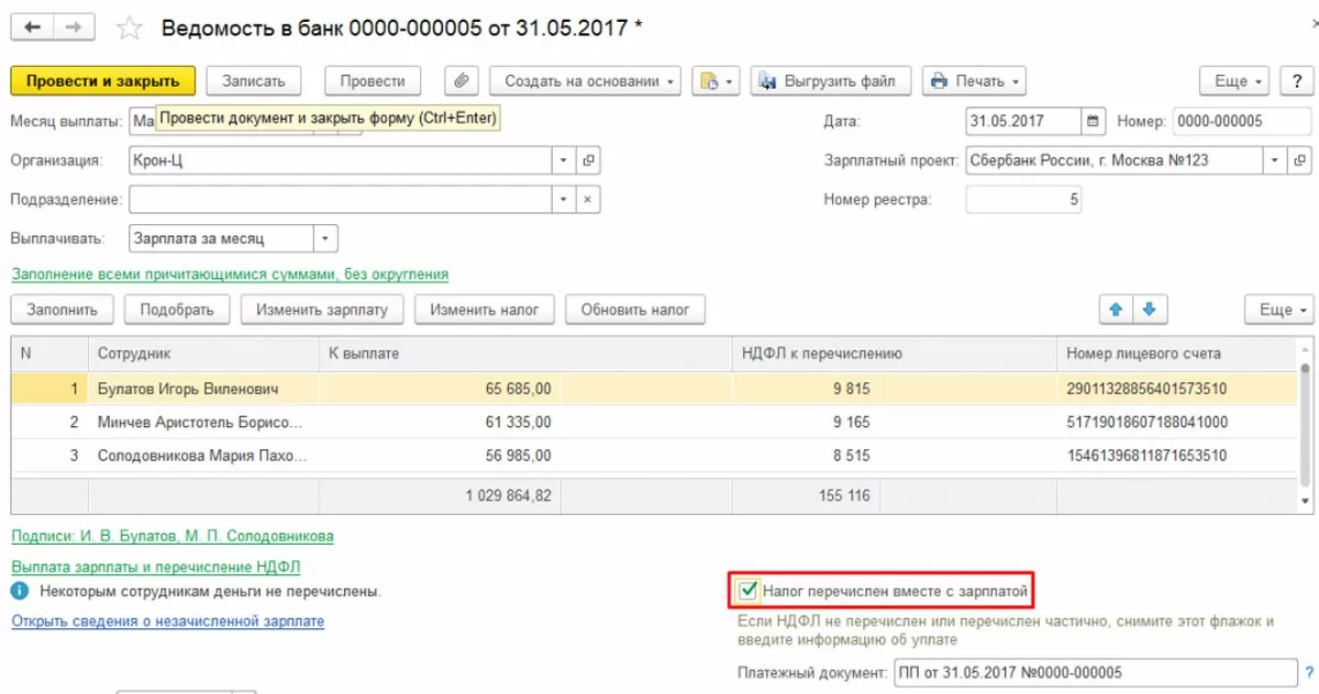 В 1С:ЗУП 3.1 уплата НДФЛ регистрируется при выплате заработной платы. Возможности приравнять начисленный НДФЛ к удержанному данная версия не предоставляет, однако при выплате зарплаты в документе «Выплата» можно указать, что налог был перечислен вместе с зарплатой, либо ввести документы «Перечисление НДФЛ».
