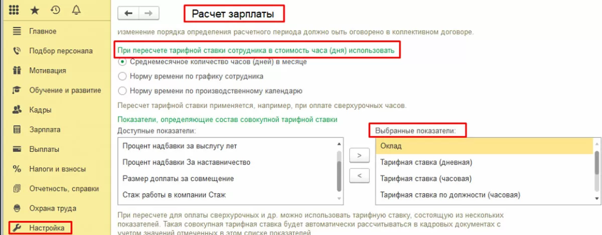 В предыдущей версии подобные начисления считались от оклада или часовой тарифной ставки. Совокупная тарифная ставка настраивается в разделе «Настройки-Расчет зарплаты». В данном разделе мы указываем показатели видов начислений, которые войдут в совокупную тарифную ставку и алгоритм подсчета часов для вычисления стоимости часа.