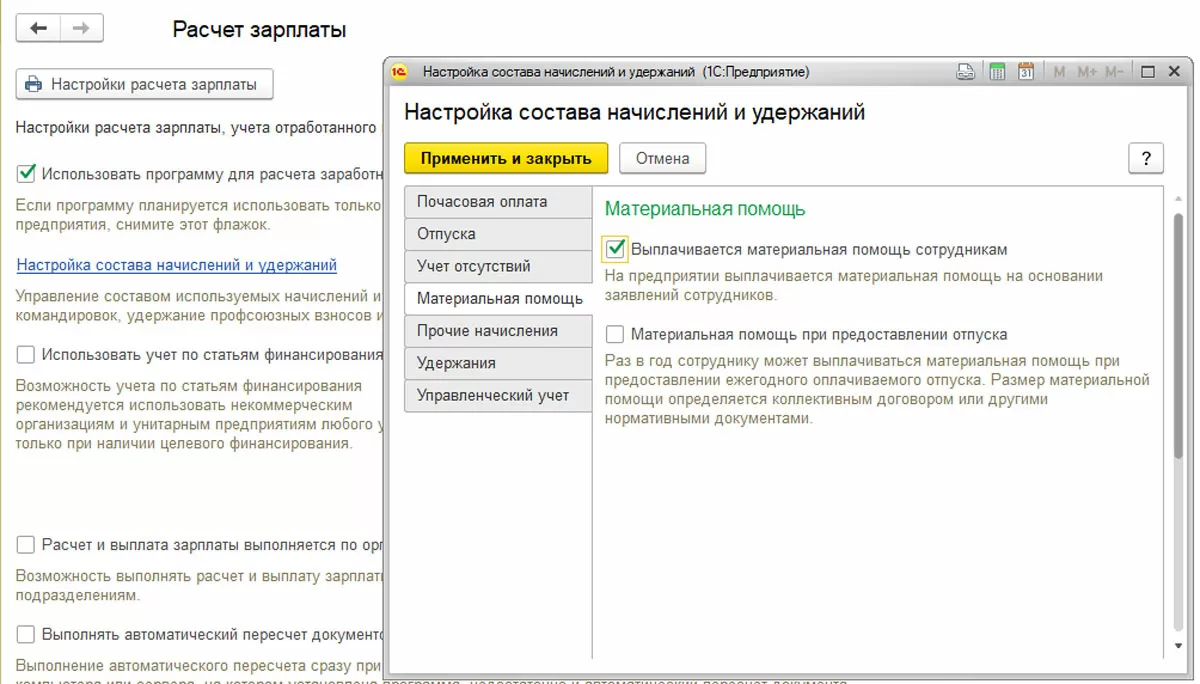 Интерфейс программы пользователь теперь может настроить самостоятельно через раздел «Настройка-Расчет зарплаты или Кадровый учет». Например, если в «Настройке состава начислений и удержаний» отметить, что на предприятии выплачивается материальная помощь сотрудникам, в программе станут видимыми и доступными соответствующие виды расчета и документы. То есть в 3.1 имеется возможность без изменения конфигурации и привлечения программистов настраивать дополнительные реквизиты и сведения, выводить значения дополнительных реквизитов и сведений в настраиваемых отчетах.
