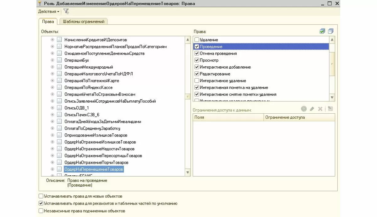 Если после анализа вы поняли, что стандартные роли не смогут полностью удовлетворить требования к разграничению прав, то необходимо их изменить. Для этого найдите нужную роль в дереве конфигурации и откройте ее двойным щелчком. В левой части открывшегося окна вы увидите перечень всех объектов конфигурации. В правой части галками отмечены те действия, права на которые заложены в этой роли, применительно к выбранному объекту слева.
