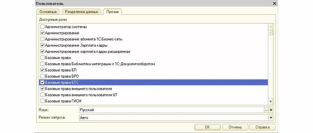 Запускайте конфигуратор вашей базы 1С под именем пользователя с полными правами и откройте меню «Администрирование» -> «Пользователи». Чтобы узнать права у конкретного пользователя, необходимо нажать на строчку с его фамилией двойным кликом и перейти на вкладку «Прочие». Галочкой будут отмечены те роли, которые доступны пользователю. Чтобы добавить определенную роль или убрать ее, измените отметки и нажмите «ОК».