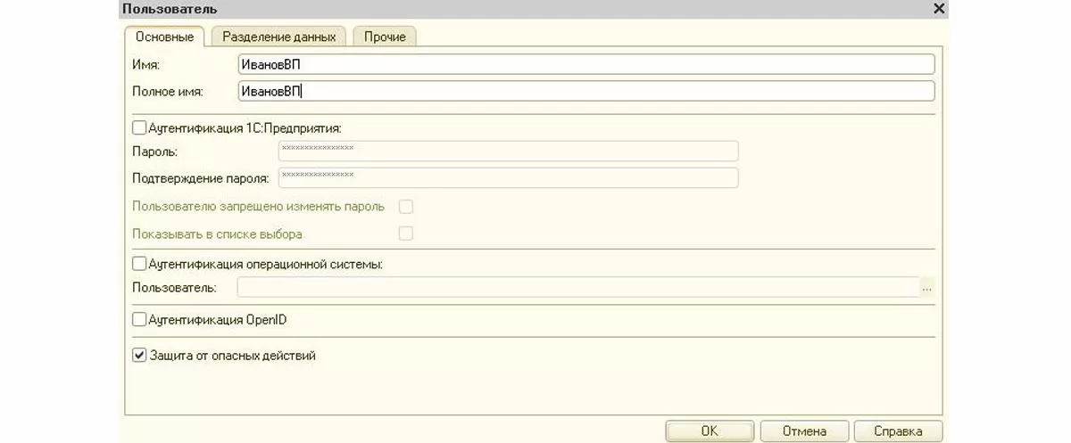 Открыв настройки пользователя 1С, необходимо снять галки, отвечающие за нахождение имени сотрудника в списке выбора и аутентификацию. Таким образом, вы запретите входить под фамилией ушедшего сотрудника и сохраните настройки прав доступа, на случай, если сотрудник вернется. Также эти настройки пригодятся, если все полномочия передадут новому сотруднику – вам не придется заново настраивать роли.
