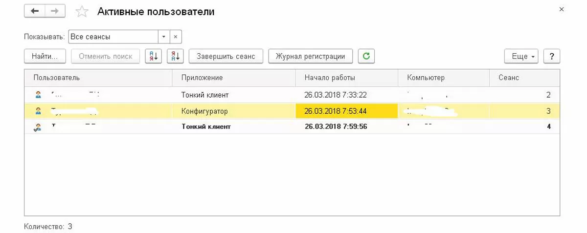 Чтобы воспользоваться первым вариантом, необходимо зайти в «НСИ и администрирование», открыть «Обслуживание» и запустить форму «Активные пользователи». Мы увидим перечень активных пользователей и сверху кнопку «Завершить», нажатие на которую позволит принудительно завершить сеансы пользователей. Кроме этого, в этом перечне можно увидеть имя компьютера и время начала работы, что поможет отследить зависшие сеансы.
