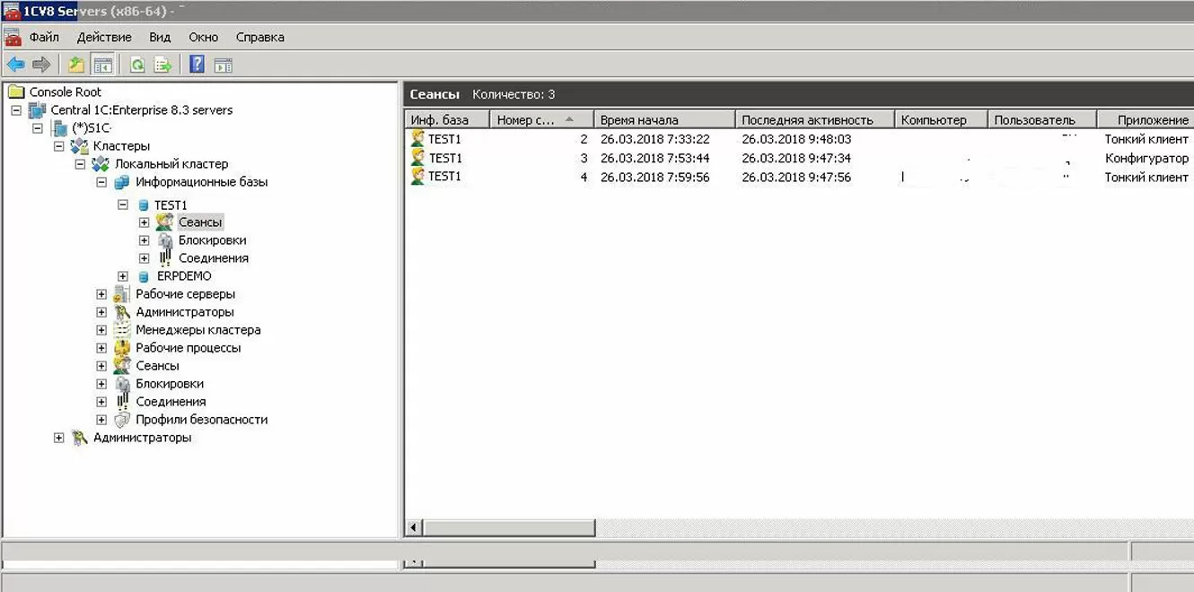 Второй вариант отключения активных пользователей требует большего внимания и ответственности, так как чаще всего консоль кластера размещают на сервере приложений. Если у вас есть доступ к этой панели управления сервером, то завершить сеанс пользователя можно следующим путем: