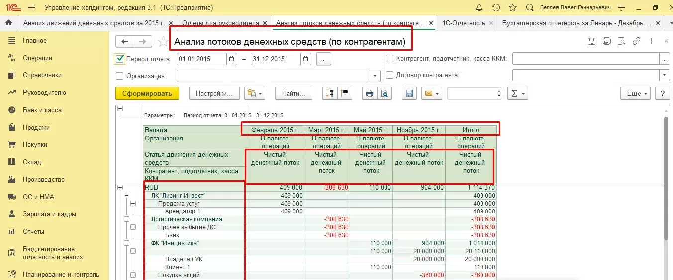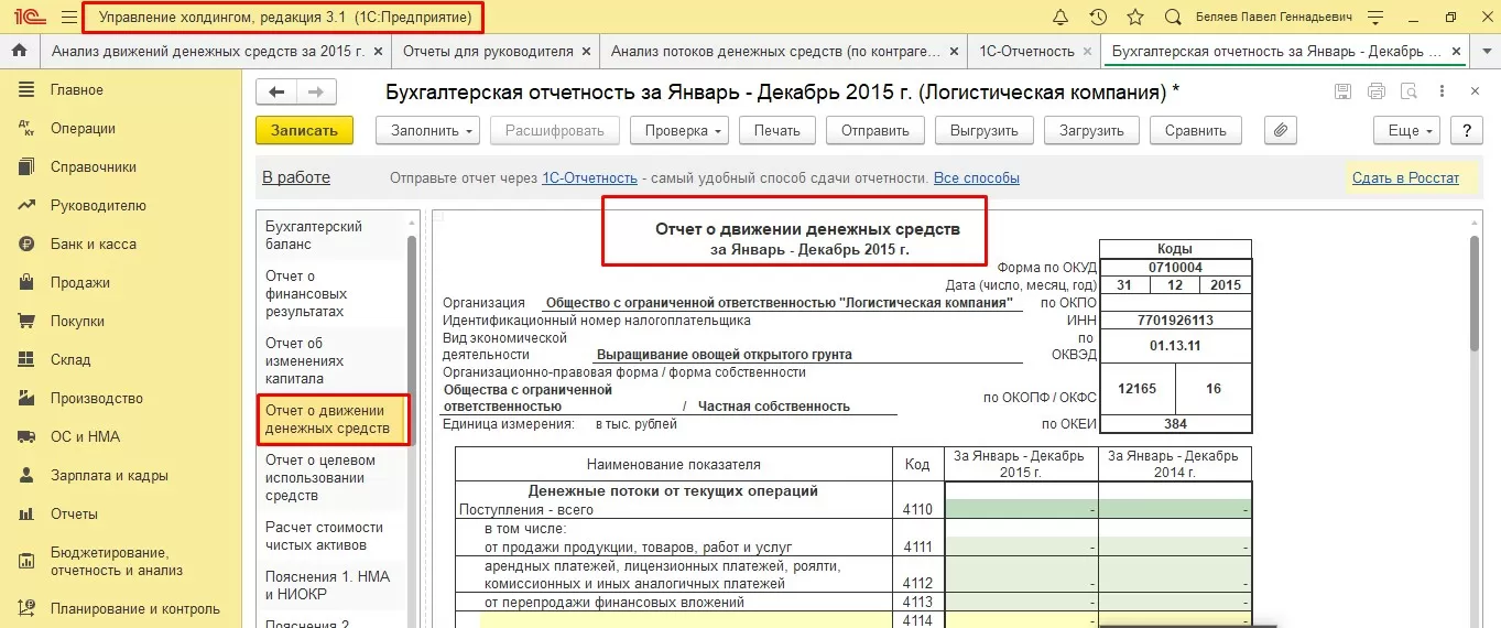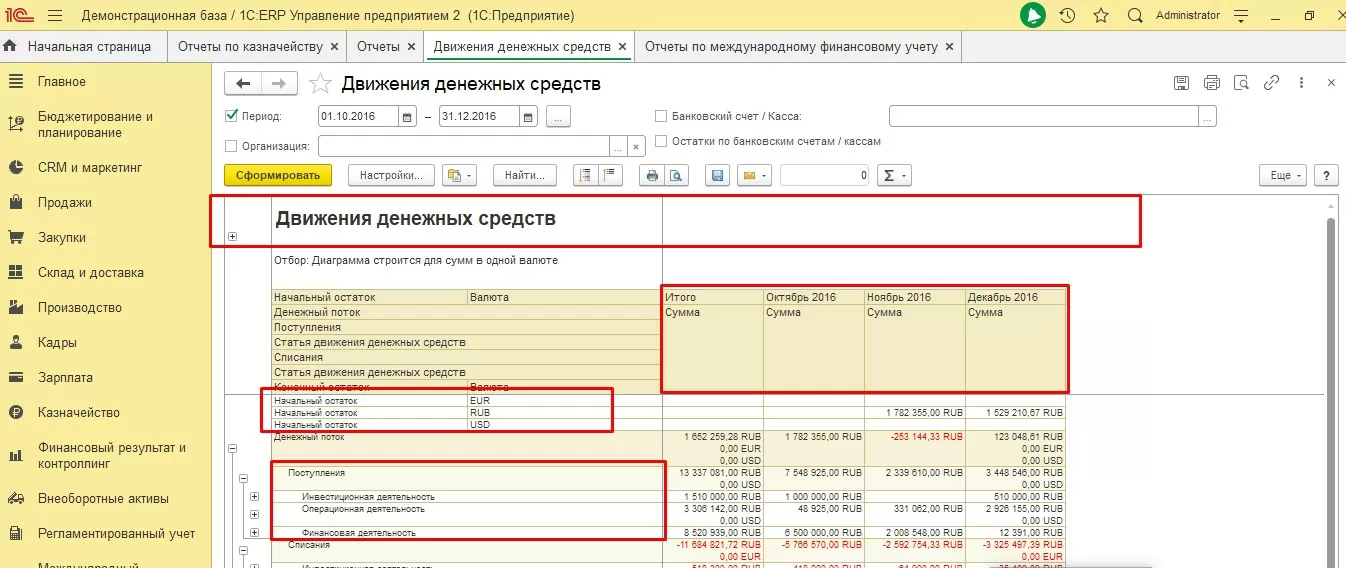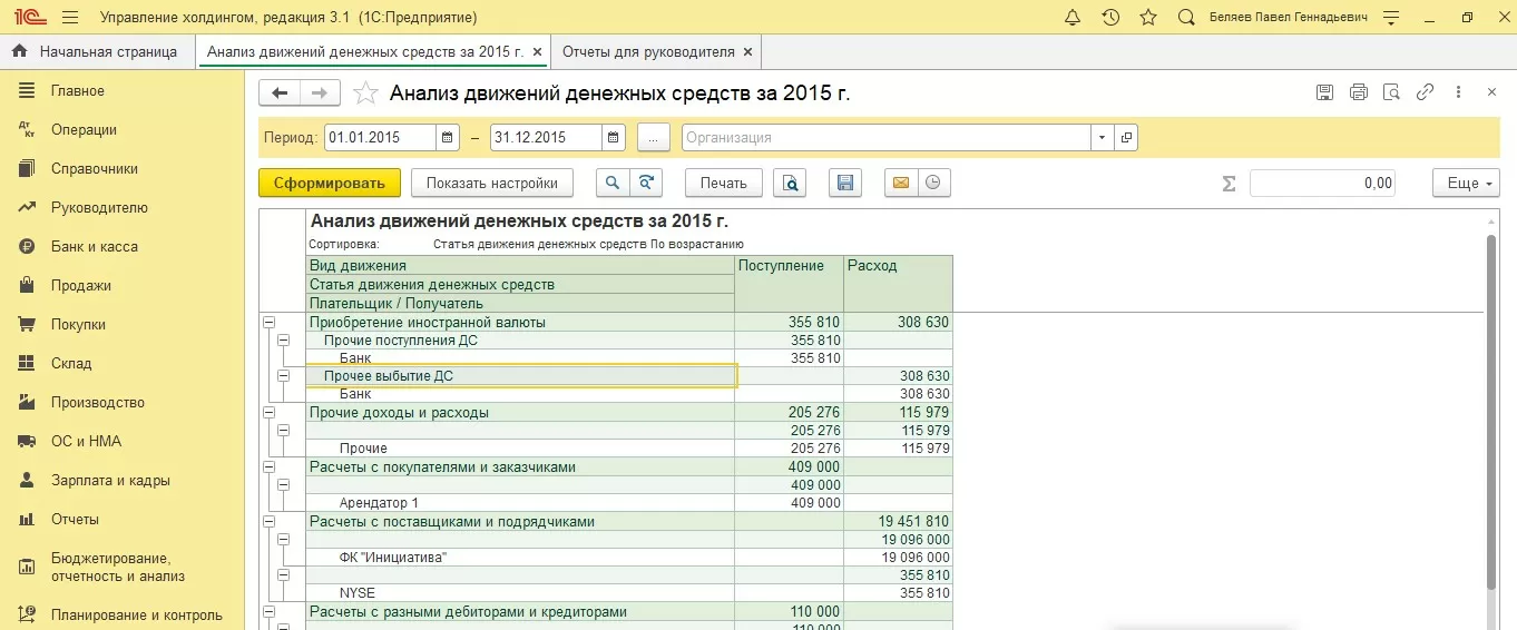 Применяя вертикальный анализ, при анализе отчетов, составленных прямым методом, можно проанализировать приход и расход ДС, чистые денежные потоки в разрезе видов деятельности компании, а также какой из этих видов более выгоден для компании экономически. В 1С:ERP есть несколько видов отчетов.