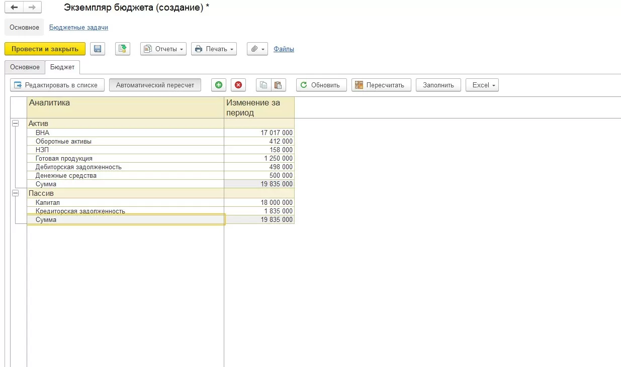 Для фиксации результата можно вручную заполнить итоговую таблицу с результатами вычислений. Для автоматического расчета дельты показателей настраивается документ «Экземпляр бюджета» раздела «Бюджетирования и планирования», который заполняется согласно фактическим данным.