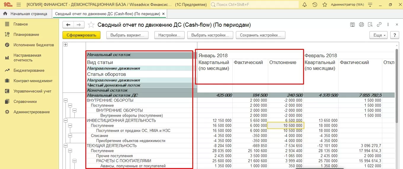 Примеры реальных проектов внедрения на базе ERP, победители конкурса 1С:Проект годаВ программном продукте WA:Финансист для этих целей можно воспользоваться отчетом «Сводный отчет по движению ДС (Cash-flow)». Он строится прямым методом и позволяет провести вертикальный и горизонтальный анализ по периодам в разрезе многих показателей. Отчет формируется классическим методом по статьям оборотов, по видам деятельности, с указанием начального и конечного остатка, с расчетом чистого денежного потока, позволяя проводить план-фактный анализ с расчетом отклонений плановых показателей от фактических.
