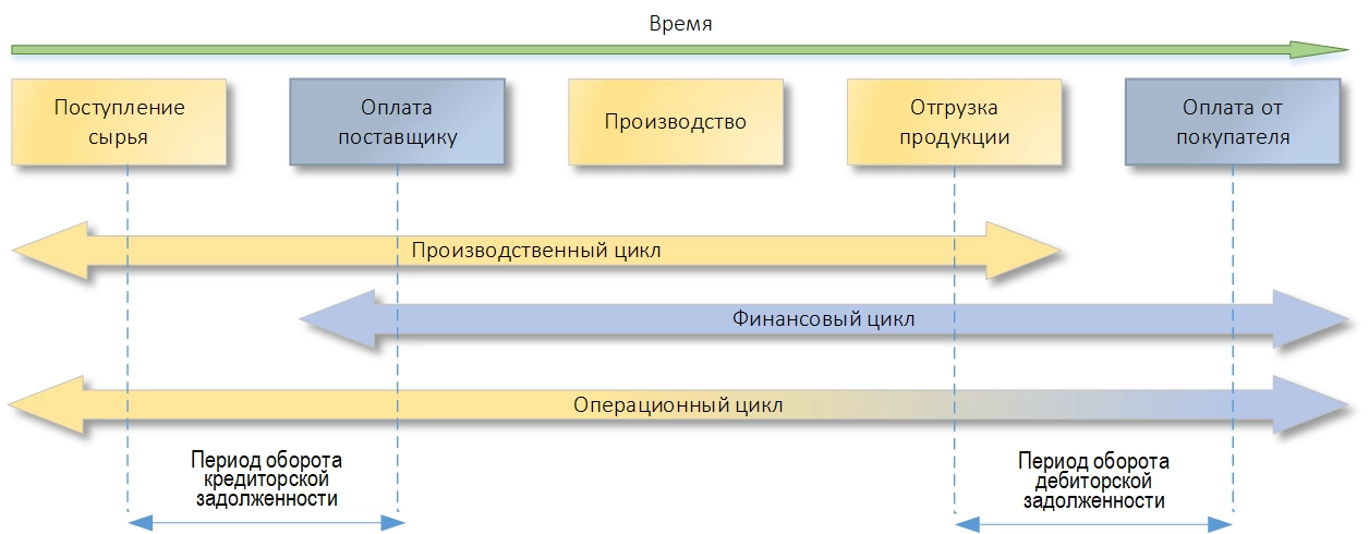 Указанные события могут происходить в разные моменты времени относительно друг друга. Длительность от самого первого события до самого последнего – это операционный цикл. Если за сырье предприятие рассчитывается с поставщиком с отсрочкой, а покупателю оно также предоставляет отсрочку платежа, то производственный, финансовый и операционный циклы выглядят вот так: