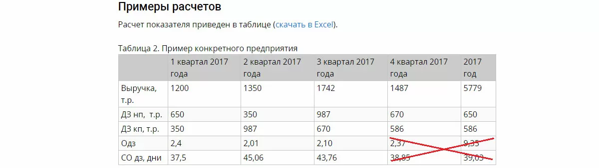 Коэффициент оборачиваемости дебиторской задолженности «Одз» за 4-й квартал (и как следствие – за год) подсчитан неверно. Период оборота дебиторской задолженности, измеряемый в днях, ошибочно назван средним остатком дебиторской задолженности «СО дз, дни» и также неверно подсчитан за 4-й квартал (и как следствие – за год).