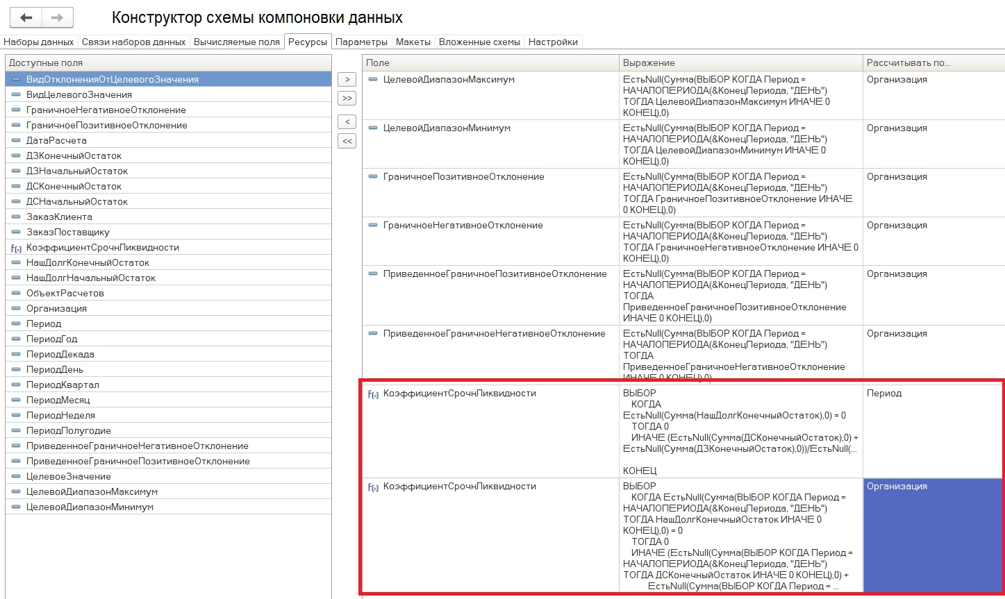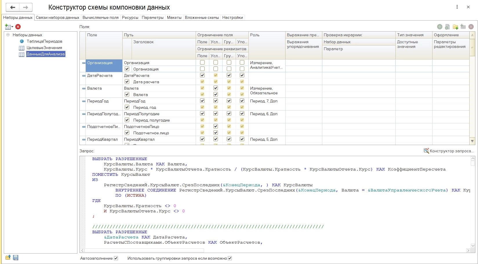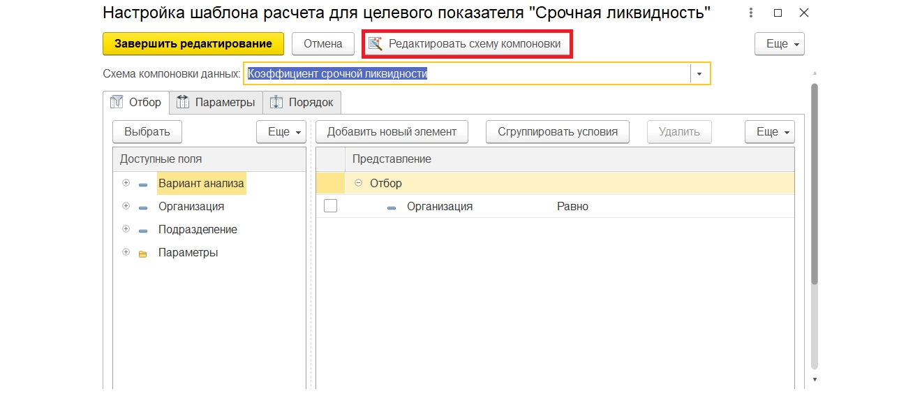 При нажатии открывается стандартное окно системы компоновки данных платформы 1С:ERP.