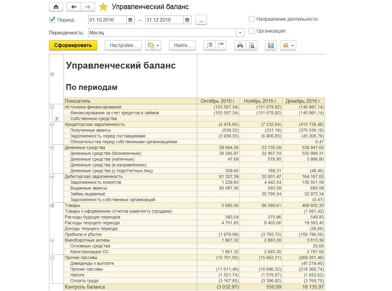 Отчет предназначен для анализа финансового состояния предприятия с контролем баланса активов и пассивов.