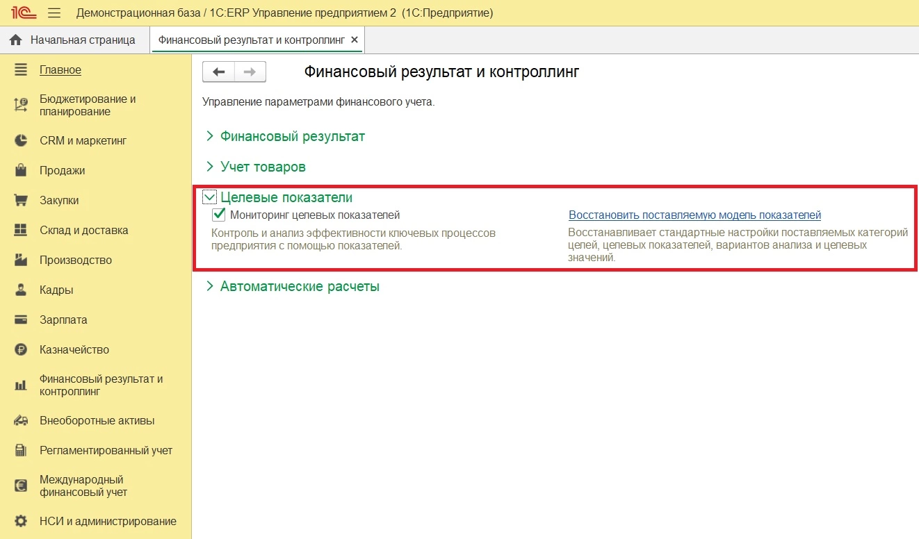 В 1С:ERP предусмотрен механизм Целевых показателей, для использования которого необходимо включить опцию «Мониторинг целевых показателей».