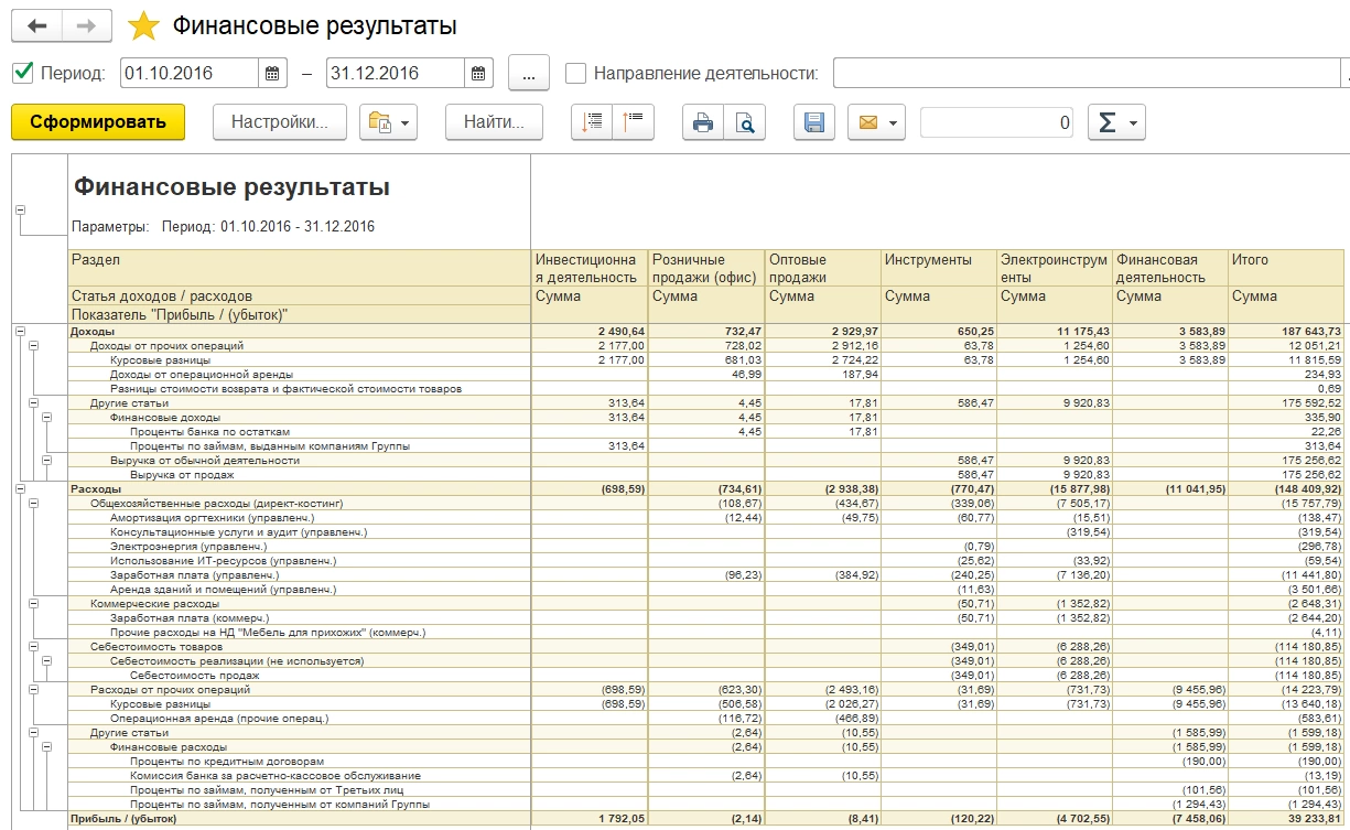 Анализ формы отчета позволит получить аналитику по финансовым результатам по направлениям деятельности с учетом иерархии статей доходов и расходов (показатели, уменьшающие прибыль, выводятся в скобках).