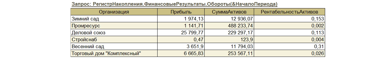 Данные управленческого баланса размещаются в регистре накоплений «ПрочиеАктивыПассивы», а данные отчета о финансовых результатах доступны в типовом регистре накоплений «ФинансовыеРезультаты». По результатам выполнения запроса будет получен коэффициент рентабельности активов по каждой из организации, внесенной в информационную базу 1С:ERP.