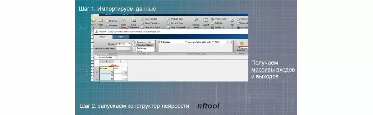 - Выбираем из воркспейса, куда были импортированы данные: Входы/Data, на которых будет происходить обучение (в примере это количество посетителей, месяц, день и наличие акции), и итоговые величины, выходы/target, соответствующие продаже магазина.