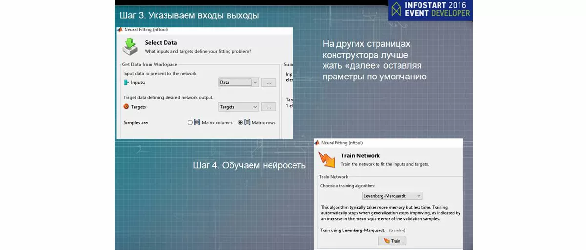Руководитель управления информационных технологий Олег Филиппов в рамках INFOSTART EVENT 2017 COMMUNITY рассказал, какие задачи можно решить с помощью нейронных сетей и генетических алгоритмов в 1С, а также как собрать такую сеть или алгоритм в 1С – что написать в коде и как это потом применить.