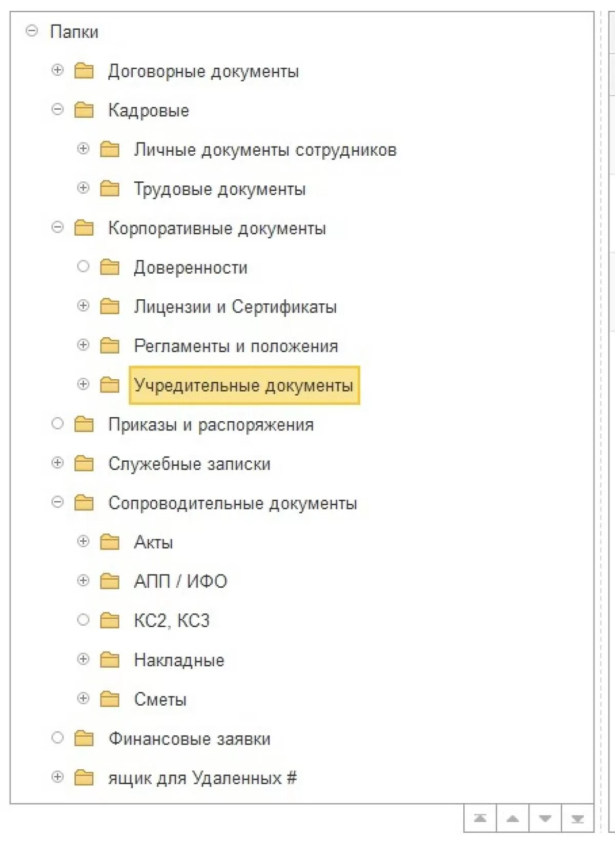Архивные документы, создаваемые по настроенной классификации видов документов, могут быть размещены по различным папкам для документов. Для папок и их подпапок настраиваются права доступа, а также некоторые другие функции программы 1С:Документооборот 8 КОРП.