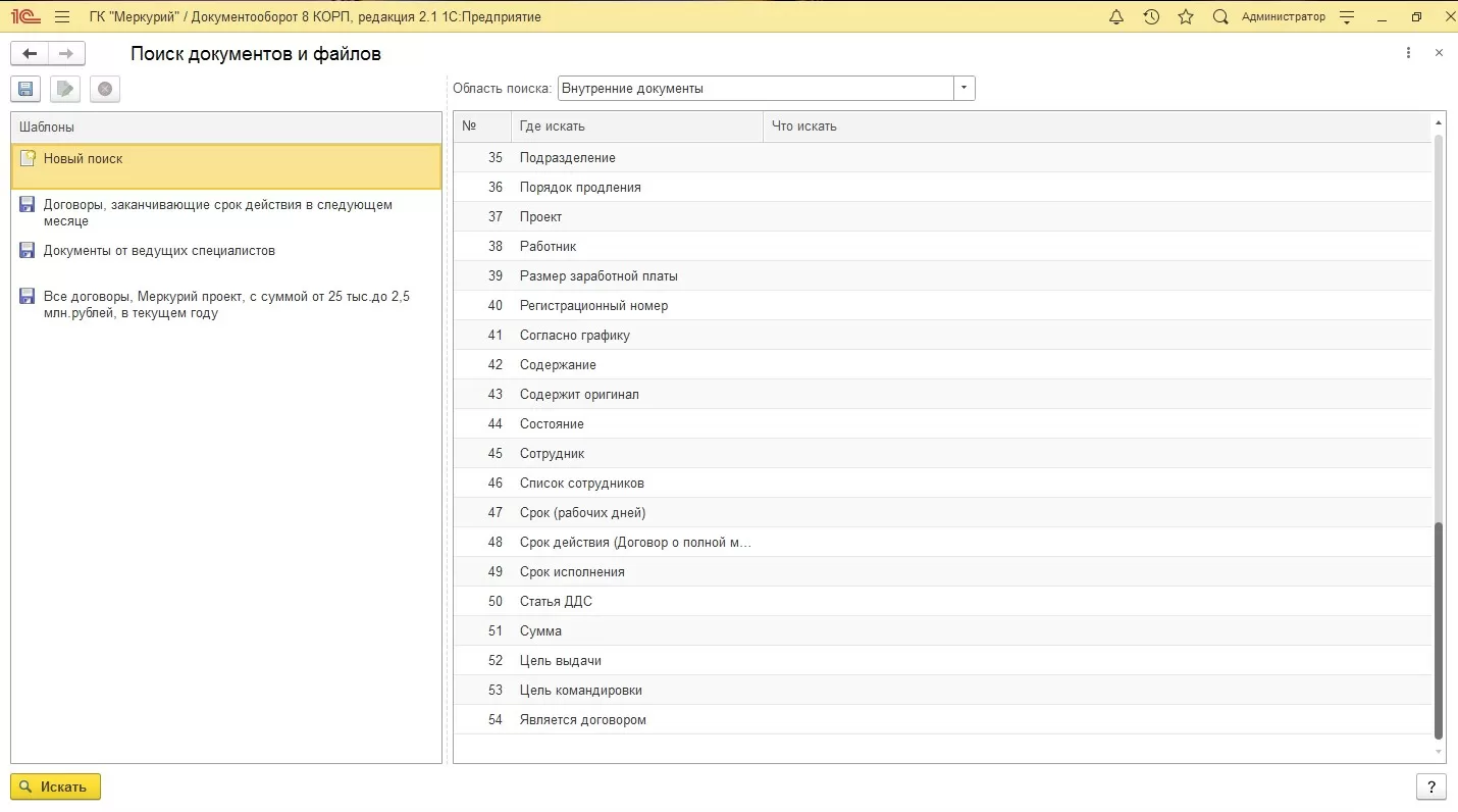 Такие поисковые запросы можно сохранять и использовать их в дальнейшем. Состав поисковых запросов определяется реквизитным составом документов.